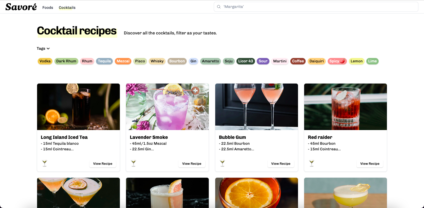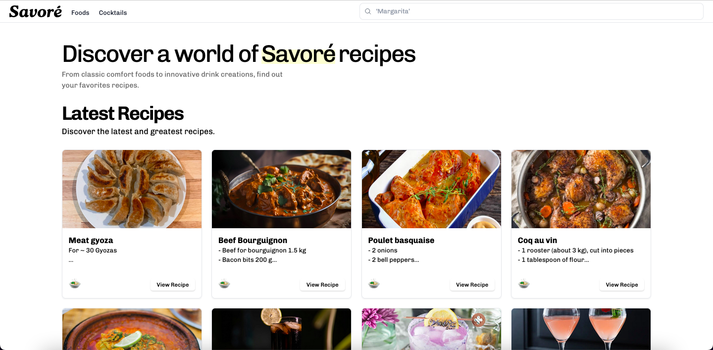 Whether you're a home cook or a mixology enthusiast, Savoré offers a streamlined platform to organize, discover, and share your favorite recipes.